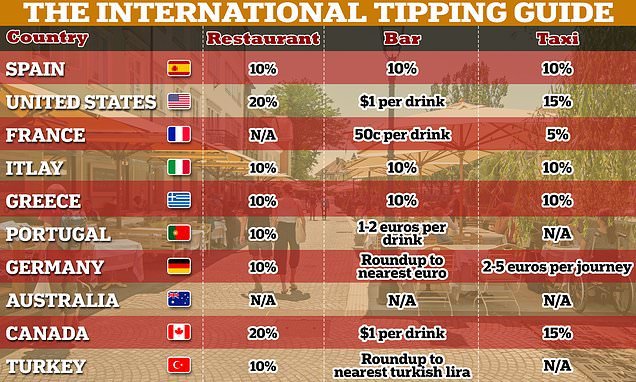 HomeMarkets Markets Do YOU know how much to tip abroad? The proper amount to pay waiters, bar staff and taxi drivers By news July 9, 2023 0 183 FacebookTwitterPinterestWhatsApp It’s finally time to go on the holiday you have been saving up all year for, carefully budgeting for each day of your trip. But panic ensues when you …This post was originally published on this site Share FacebookTwitterPinterestWhatsApp Subscribe Login Notify of new follow-up comments new replies to my comments Please login to comment 0 Comments Inline Feedbacks View all comments Stay Connected149,466FansLike396,312FollowersFollow2,650SubscribersSubscribe Latest Articles Markets Claude dethrones ChatGPT as top U.S. app after Pentagon saga Markets The Death of Khamenei and the End of an Era Markets Trump Says Iran’s Supreme Leader Is Dead Market News US‑Israeli attack on Iran risks plunging the world into turmoil (and my take) Markets Iran strikes were launched without approval from Congress, deeply dividing lawmakers Markets ☢️ World War Trump: The Pentagon Ultimatum – AI Weaponization and Constitutional Collapse Hot Items Zeihan: Attack on Iran Underway AI Anthropic CEO responds to Trump order, Pentagon clash Charts PSW’s Weekly Webinar: The State of the Markets Report (2/25/2026) AI Trump Orders Government to Stop Using Anthropic After Pentagon Standoff Markets Fall Back Friday – February Ending on a Week Note? AI AI “hot takes” are becoming a market risk Hot Items How Trump’s renewed tariff chaos will stifle investment around the world Market News Netflix Backs Out of Bid for Warner Bros., Paving Way for an Ellison Takeover Load more