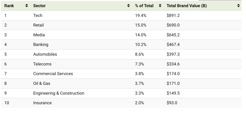 After retail and media, the banking sector still held significant brand sway at $467 billion. Automobiles rounded out the top five sectors at $397 billion, led by companies like Tesla and Mercedes-Benz.