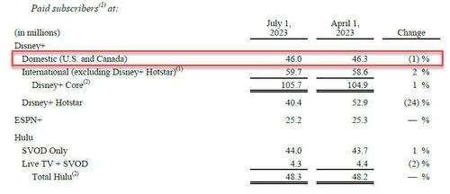 - The bad news is that Disney+ streaming subs tumbled 7.4% to 146.1 million from the previous three months, missing the 154.8 million consensus analysts had expected. While nearly all of that shortfall was borne by the company’s Disney+ Hotstar in Asia where it lost almost 25% of its customers after Disney failed to renew streaming rights for popular cricket games in the Indian Premier League, domestic Disney+ subs also dropped: subs in the U.S. and Canada dropped to 46 million subscribers, from 46.3 million in the previous quarter; marked the second time ever that the company saw Disney+ lose North American subscribers.