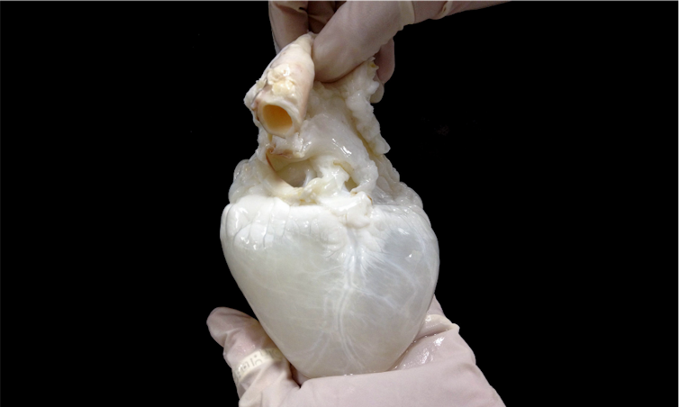 So my team and I went with the next best thing: a pig heart. Pig hearts are similar to human hearts in terms of their size and structure. Both have four chambers – two atria and two ventricles – responsible for pumping blood. And structures from pig hearts such as valves have been used in humans safely.