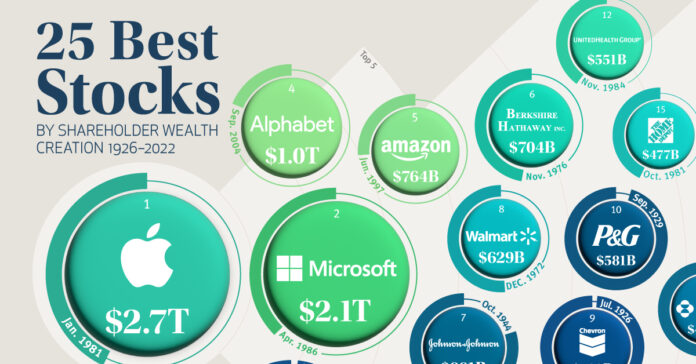HomeMarkets Markets The 25 Best Stocks by Shareholder Wealth Creation (1926-2022) By news September 7, 2023 0 167 FacebookTwitterPinterestWhatsApp Out of 28,114 publicly-listed U.S. companies analyzed over the last century, the 25 best stocks have created nearly a third of all shareholder wealth. …This post was originally published on this site Share FacebookTwitterPinterestWhatsApp Subscribe Login Notify of new follow-up comments new replies to my comments Please login to comment 0 Comments Inline Feedbacks View all comments Stay Connected149,501FansLike396,312FollowersFollow2,650SubscribersSubscribe Latest Articles Markets Get Ready for Zombie Tariffs Hot Items The Supreme Court Just Ruled Trump’s Tariffs Unconstitutional Market News Supreme Court Blocks Tariffs Hours After Trump Bragged They Wouldn’t Markets TGIF Friday – Short Week Not Short Enough in the Fog of War Markets The Worst-Case Future for White-Collar Workers Markets Russia tested NATO’s airspace 18 times in 2025 alone – a 200% surge that signals a dangerous shift AI DHS Opens a Billion-Dollar Tab With Palantir Market News From Iran to Ukraine: The growing risk of conflict Markets Thursday Thoughts – Oil at $66.6 Again – Bad Sign? Market News Japan’s Debt Crisis Is Just the Beginning Biotech FDA’s abrupt flip-flop on Moderna’s mRNA flu shot highlights growing risks to drug-makers of investing in vaccines Market News Fed Minutes Show No Rush to Restart Rate Cuts, and Even Possibility of Hikes Climate Why big oil is not interested in Venezuela Markets Which Way Wednesday? Markets, Media, and Income in the AI Era Load more