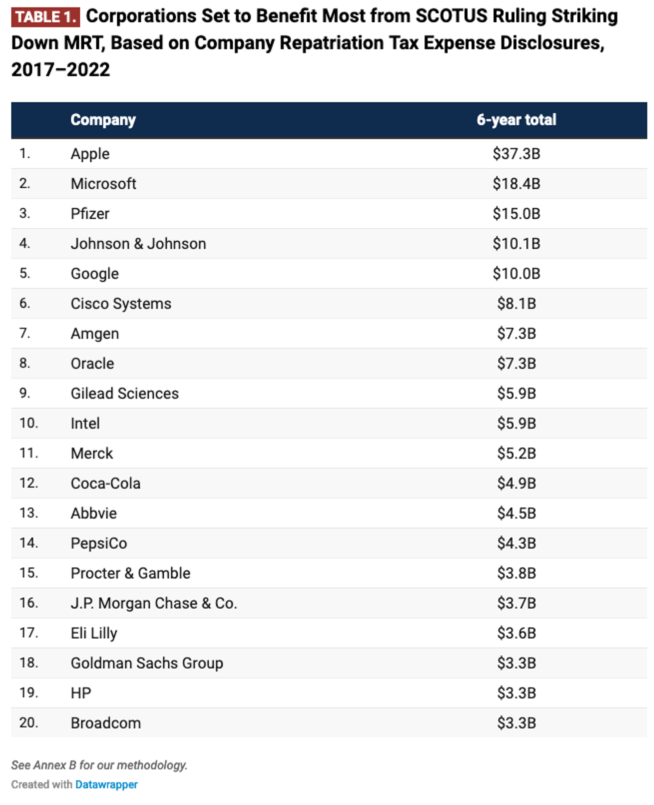 The report identifies more than 370 companies disclosing an estimated tax bill of over $270 billion. Just five of the largest tech and pharma firms (Apple, Pfizer, Microsoft, Johnson & Johnson, and Google) were responsible for one-third of this tax bill due to their concerted efforts to send pre-2018 income offshore. Dozens of other companies with large offshore holdings, including IBM, fail to disclose their transition tax liability, and companies that aren’t publicly traded aren’t required to disclose these amounts, so the total transition tax yield is likely much larger. If the Moore case invalidates the transition tax, these tax bills could be completely forgiven, and Apple alone could see a tax break of $37 billion.