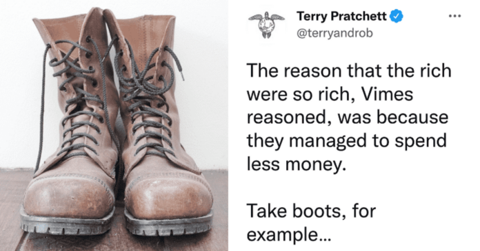 HomeMarkets Markets Terry Pratchett’s ‘boots’ theory about why it’s expensive to be poor goes viral again By news September 29, 2023 0 170 FacebookTwitterPinterestWhatsApp The often-cited ‘Sam Vimes ‘Boots’ theory of socio-economic unfairness’ is from the late author’s 1993 book, ‘Men At Arms.’ Editor’s note: This …This post was originally published on this site Share FacebookTwitterPinterestWhatsApp Subscribe Login Notify of new follow-up comments new replies to my comments Please login to comment 0 Comments Inline Feedbacks View all comments Stay Connected149,501FansLike396,312FollowersFollow2,650SubscribersSubscribe Latest Articles Markets Putin’s shadow fleet could be wiped out in 2-3 months Markets What I Learned at PhilStockWorld.com Last Week – An AGI Round Table Review Charts PSW’s Weekly Webinar: Portfolio Review & FED Minutes (2/18/2026) AI Jared Sleeper on Which Software Companies Will Survive the SaaSpocalypse Market News Get Ready for Zombie Tariffs Hot Items The Supreme Court Just Ruled Trump’s Tariffs Unconstitutional Market News Supreme Court Blocks Tariffs Hours After Trump Bragged They Wouldn’t Markets TGIF Friday – Short Week Not Short Enough in the Fog of War AI The Worst-Case Future for White-Collar Workers Market News Russia tested NATO’s airspace 18 times in 2025 alone – a 200% surge that signals a dangerous shift AI DHS Opens a Billion-Dollar Tab With Palantir Market News From Iran to Ukraine: The growing risk of conflict Markets Thursday Thoughts – Oil at $66.6 Again – Bad Sign? Market News Japan’s Debt Crisis Is Just the Beginning Load more