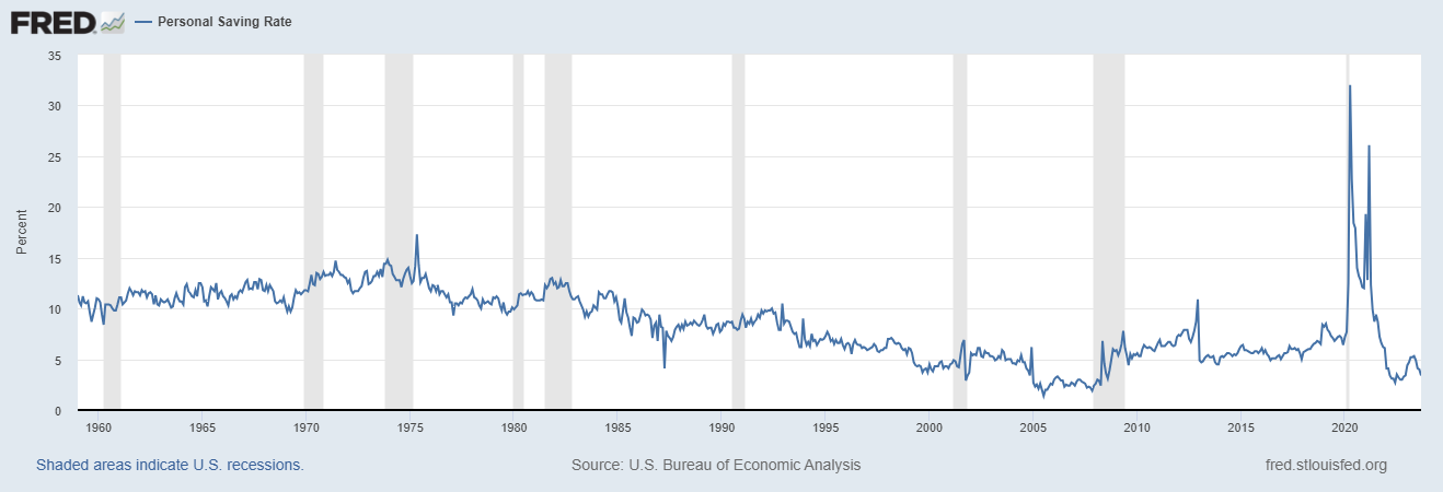 U.S. personal saving rates decreased to 3.4%, down from 32% in April 2020. According to the University of Michigan, the U.S. Consumer Sentiment Index fell to 63.8 in October, down from 99.8 in 2020 and that makes sense as falling 5.6% behind in buying power and having no savings left can make people a little gloomy in their outlook, right?