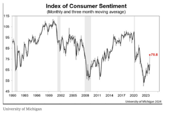 A funny thing happened on the way to the 2024 election. Well, actually, a lot of funny things happened. (Ron DeSantis!) But I’m talking about the economy. As I wrote in my latest column, there seems to have been a sudden upswing in consumer sentiment, which is finally starting to catch up with the reality that inflation has plunged while unemployment has remained low.