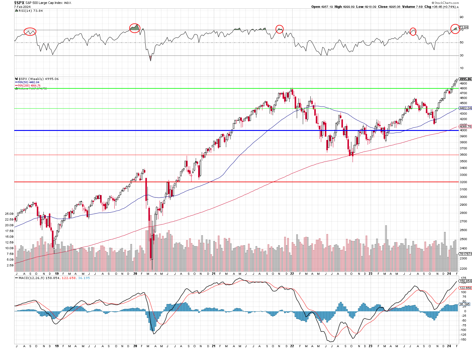 Technically it’s just a number – there’s nothing actually significant about S&P 5,000 as it is, in THEORY, just an aggregate accounting of what should be millions of individual decisions that are made by traders each day on the 500 individual stocks that make up the index BUT the psychological impact of such milestones cannot be understated. In the world of investing, these round numbers often serve as symbolic markers, capturing the attention of both the media and the market participants, thereby influencing sentiment and behavior.