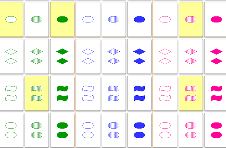 Players race to look for “sets,” which are groups of three cards in which every feature is either the same or different in each card. For instance, cards with one solid red diamond, two solid green diamonds and three solid purple diamonds form a set: All three have different numbers (one, two, three), the same shading (solid), different colors (red, green, purple) and the same shape (diamond).