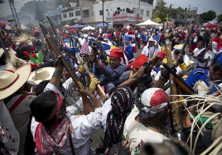 Mexicans representing indigenous soldiers and the French army, re-enact the battle of Puebla during Cinco de Mayo celebrations in Mexico City. AP Photo/Eduardo Verdugo