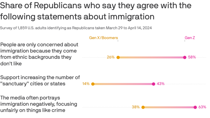 HomeMarkets Markets The GOP’s deep generational split on immigration By news May 6, 2024 0 234 FacebookTwitterPinterestWhatsApp Young Republicans are notably more moderate on immigration than the elders in their party, according to an Axios Vibes survey by The Harris Poll. Why …This post was originally published on this site Share FacebookTwitterPinterestWhatsApp Subscribe Login Notify of new follow-up comments new replies to my comments Please login to comment 0 Comments Inline Feedbacks View all comments Stay Connected149,543FansLike396,312FollowersFollow2,640SubscribersSubscribe Latest Articles Markets Monday Morning Report: Dow 50K, The Super Bowl Hangover, and The China Syndrome Markets PhilStockWorld’s Weekly Wrap-Up – 🏦 The Matrix Economy: Capital Hegemony and the Infrastructure War Markets They Aren’t Acting Like They Might Lose Charts PSW’s Weekly Webinar: $700/Month Portfolio Review & Q4 Earnings Update (2-4-26) Markets Manufacturing Construction Spending Declines Under Trump Markets Flip Flop and Friday – TERRIBLE Jobs Numbers Save the Market Markets Jeffrey Epstein’s Money Mingled With Silicon Valley Start-Ups Markets The rise and fall (and rise again) of gold prices – what’s going on? Markets Farcical peace talks continue in Abu Dhabi as Ukraine shivers under Russia’s winter onslaught Markets Why futuristic, tech-centred ‘smart city’ projects are destined to fail Markets Crypto Takes a Deep Slide Despite Trump’s Support Markets The jobs market is starting to show hard-to-ignore cracks Markets A High-Stakes Poker Game for Control of the World’s AI Crown Market News Webinar: FOMC Statement, Powell and our Top Trade Review! (In case you missed this, from 1-28!) Load more