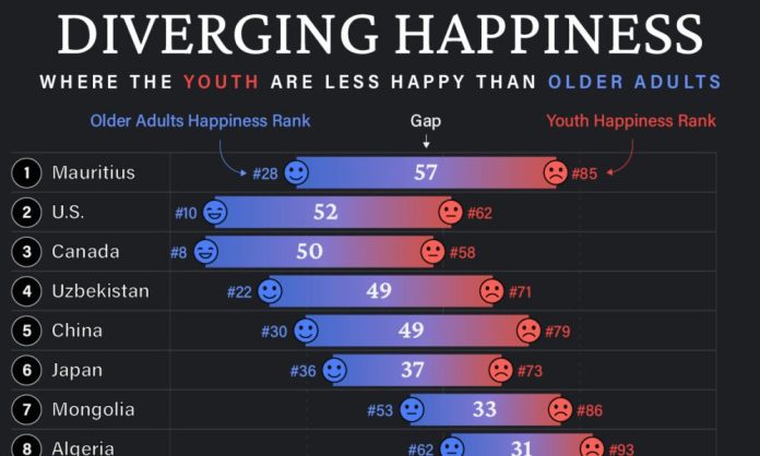 HomeMarkets Markets Ranked: Countries Where Youth are the Most Unhappy, Relative to Older Generations By news May 18, 2024 0 164 FacebookTwitterPinterestWhatsApp “They say a person needs just three things to be truly happy in this world: someone to love, something to do, and something to hope for.” — Tom Bodett …This post was originally published on this site Share FacebookTwitterPinterestWhatsApp Subscribe Login Notify of new follow-up comments new replies to my comments Please login to comment 0 Comments Inline Feedbacks View all comments Stay Connected149,470FansLike396,312FollowersFollow2,650SubscribersSubscribe Latest Articles Markets AI’s growing appetite for power is putting Pennsylvania’s aging electricity grid to the test Markets Epstein Files Are Missing Records About Woman Who Made Claim Against Trump Market News Violent aftermath of Mexico’s ‘El Mencho’ killing follows pattern of other high‑profile cartel hits AI Nvidia’s Quarterly Profit Hits $43 Billion on Strong A.I. Chip Sales Markets ⚡ Powering the AI Boom: Data Centers and Ratepayer Protection Pledge (SCAM!!!) Markets PhilStockWorld Top Trade Alert – Feb 25th, 2026 – HP, Inc. (HPQ) Markets Whiplash Wednesday – Back in Black for the Week Markets How Jeffrey Epstein Ingratiated Himself With Top Microsoft Executives Biotech The Deaths Doctors Never Thought They’d See in the U.S. Markets The Truth You Can Buy: How Prediction Markets Became Democracy’s Newest Threat Markets State of the Market Tuesday – 6 Fed Speakers, HD, HPQ and Trump as We Wait for CRM and NVDA Markets What Travelers Need to Know as Cartel Violence Rattles Mexico News The NYPD Arrested Epstein. Then the FBI Intervened. Market News Trump Secretary Silent as Sons Poised to Make Bank From End of Tariffs Load more