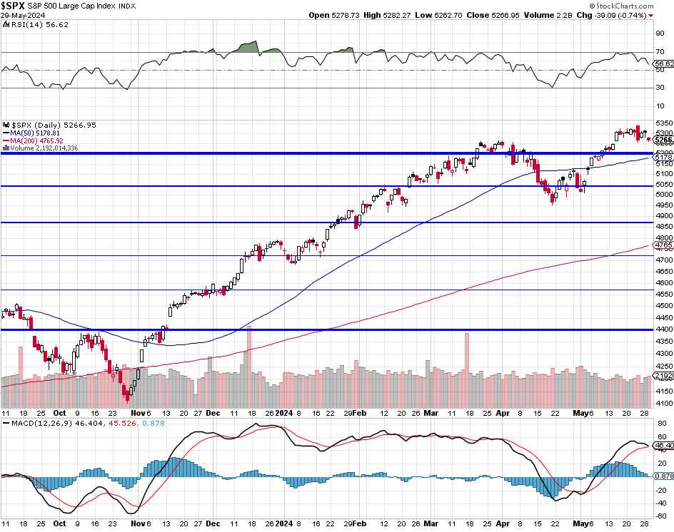 Notice that 50-day moving average is about to cross over 5,200. If that happens, that line will firm up as good support and we’re 21 below 5,200 and the index and the S&P is at 5,235 this morning (7:45) so 135/50(days) is 2.7 points per day so we need the S&P to stay this far above 5,200 for 2 full weeks in order to get the 50 dma over 5,200 and, until then – we are in danger of being rejected at that line and suddenly we’ll have an ugly chart.