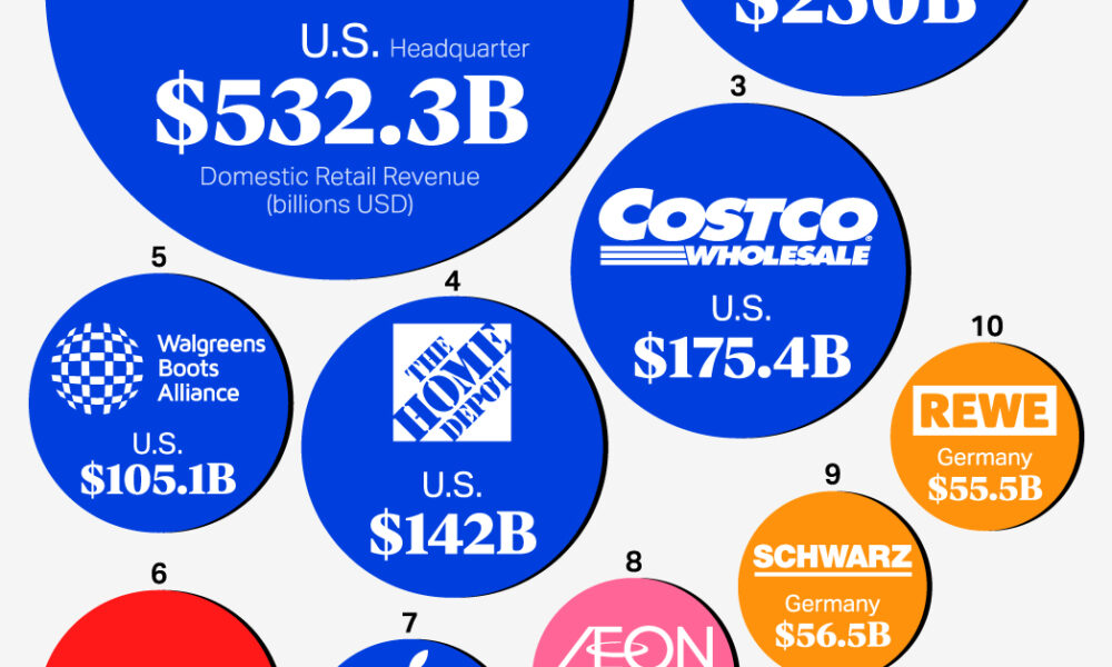 HomeMarkets Markets The World’s Top Retail Companies, by Domestic Revenue By news June 13, 2024 0 146 FacebookTwitterPinterestWhatsApp The retail sector plays a vital role in powering economies, contributing $5.3 trillion annually to America’s GDP alone. Moreover, the industry is …This post was originally published on this site Share FacebookTwitterPinterestWhatsApp Subscribe Login Notify of new follow-up comments new replies to my comments Please login to comment 0 Comments Inline Feedbacks View all comments Stay Connected149,469FansLike396,312FollowersFollow2,650SubscribersSubscribe Latest Articles Charts PSW’s Weekly Webinar: The State of the Markets Report (2/25/2026) Markets Trump Orders Government to Stop Using Anthropic After Pentagon Standoff Markets Fall Back Friday – February Ending on a Week Note? Markets AI “hot takes” are becoming a market risk Markets How Trump’s renewed tariff chaos will stifle investment around the world Market News Netflix Backs Out of Bid for Warner Bros., Paving Way for an Ellison Takeover AI Anthropic Takes a Stand Markets A Modest Proposal For Solving the AI Energy Crisis Markets Thursday Thrust: One Stock to Rule Us All (NVDA, of course!) AI AI’s growing appetite for power is putting Pennsylvania’s aging electricity grid to the test Markets Epstein Files Are Missing Records About Woman Who Made Claim Against Trump Market News Violent aftermath of Mexico’s ‘El Mencho’ killing follows pattern of other high‑profile cartel hits AI Nvidia’s Quarterly Profit Hits $43 Billion on Strong A.I. Chip Sales Markets ⚡ Powering the AI Boom: Data Centers and Ratepayer Protection Pledge (SCAM!!!) Load more