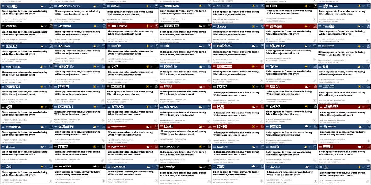 HomeMarkets Markets Sinclair floods local news websites with hundreds of deceptive articles about Biden’s mental fitness By news June 17, 2024 0 178 FacebookTwitterPinterestWhatsApp This month, Sinclair Broadcast Group has flooded a vast network of local news websites with misleading articles suggesting that President Biden is …This post was originally published on this site Share FacebookTwitterPinterestWhatsApp Subscribe Login Notify of new follow-up comments new replies to my comments Please login to comment 0 Comments Inline Feedbacks View all comments Stay Connected149,449FansLike396,312FollowersFollow2,650SubscribersSubscribe Latest Articles Markets Hezbollah − degraded, weakened but not yet disarmed − destabilizes Lebanon once again Markets The Real Reason Trump Went to War Markets 🌋 Weakovering Wednesday: Markets in Crisis: The Hormuz Conflict and Global Volatility Energy What is the Strait of Hormuz, and why does its closure matter so much to the global economy? Hot Items A Plan B for space? On the risks of concentrating national space power in private hands Energy Iran’s targeting of airport, ports and hotels in reaction to US strikes has forced Gulf nations onto front lines of a war – Hot Items Donald Trump has made some bold claims on the US economy. But how do they stack up against the data? Energy ‘Destruction is not the same as political success’: US bombing of Iran shows little evidence of endgame strategy Markets Toppling Tuesday – Regimes and Markets Edition Biotech RFK Jr. Lied His Way Into Office and American Health Is the Victim Markets Putin Is the Iran War’s One Sure Winner Markets Trump Makes Surreal Turn From Talking War to Mocking Melania AI The SaaSpocalypse Has Arrived…Or Has It? Markets Trump’s lethal presidency Load more