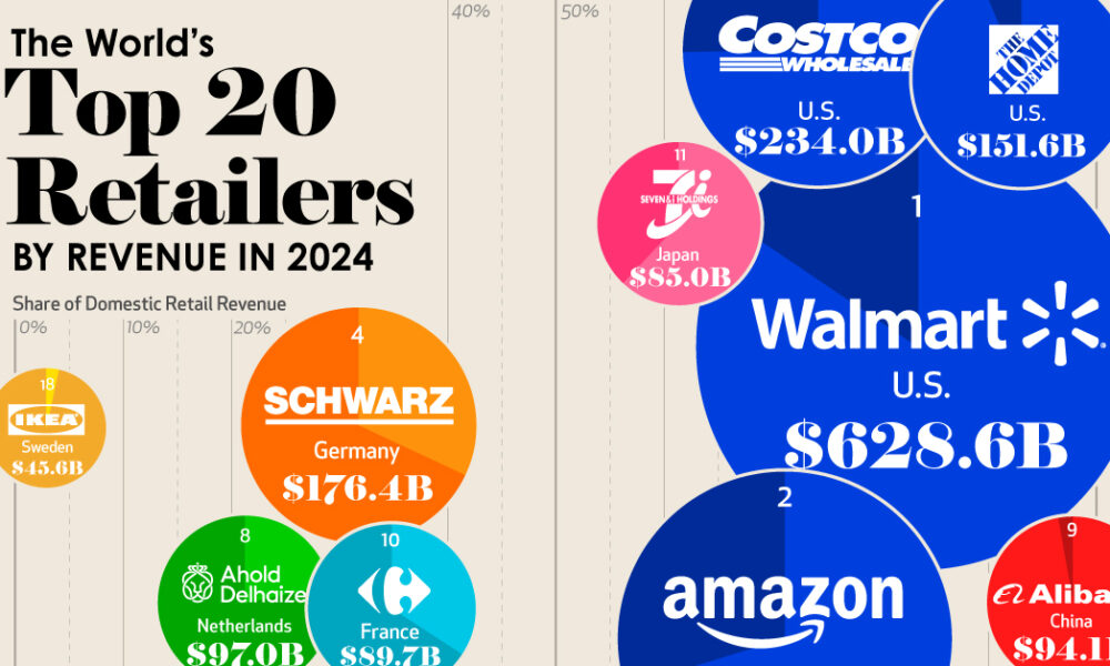 HomeMarkets Markets Ranked: The 20 Top Retailers Worldwide, by Revenue By news June 21, 2024 0 88 FacebookTwitterPinterestWhatsApp The global retail landscape is constantly evolving, driven by shifting consumer habits and the growing dominance of online sales. Despite the rise of …This post was originally published on this site Share FacebookTwitterPinterestWhatsApp Subscribe Login Notify of new follow-up comments new replies to my comments Please login to comment 0 Comments Inline Feedbacks View all comments Stay Connected149,309FansLike396,312FollowersFollow2,660SubscribersSubscribe Latest Articles Markets Trump risks falling in to the ‘asymmetric resolve’ trap in Iran − just as presidents before him did elsewhere Markets Pam Bondi’s extreme political loyalty to Trump wasn’t enough to save her job Markets The Market Is Rallying Into a War — And That Should Make You Nervous Charts World War III, Month II, Day 33 (4/1/2026) Markets F*cked Up Thursday – Donald Trump Breaks the World – Again Energy Why the damage to Qatar’s gas infrastructure could push costs higher for years to come Markets Trump risks falling in to the ‘asymmetric resolve’ trap in Iran − just as presidents before him did elsewhere Markets Trump’s Fateful Choice Top Trades PSW Top Trade Alert – April 1st 2026 – Nike (NKE) Markets PhilStockWorld Top Trade Alert – April 1st 2026 – Conagra Brands (CAG) Markets Wednesday Recovery – Hope Springs Eternal Ahead of Trump’s Speech This Evening Market News Trump Is Flailing on Iran Market News The Psychology of Military Incompetence Market News No Good Way Out Load more