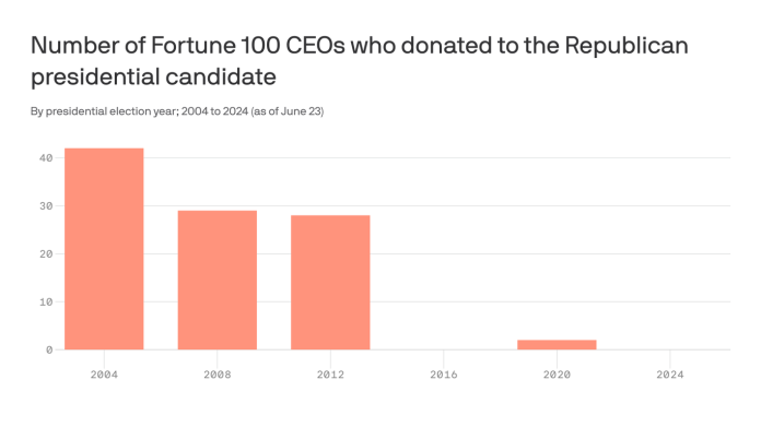 HomeMarkets Markets Trump’s underwhelming business support By news June 25, 2024 0 126 FacebookTwitterPinterestWhatsApp There are zero Fortune 100 CEOs — a group that historically leans Republican — that have donated to former President Trump this election cycle, …This post was originally published on this site Share FacebookTwitterPinterestWhatsApp Subscribe Login Notify of new follow-up comments new replies to my comments Please login to comment 0 Comments Inline Feedbacks View all comments Stay Connected149,546FansLike396,312FollowersFollow2,640SubscribersSubscribe Latest Articles Markets Monday Morning Report: Dow 50K, The Super Bowl Hangover, and The China Syndrome Markets PhilStockWorld’s Weekly Wrap-Up – 🏦 The Matrix Economy: Capital Hegemony and the Infrastructure War Markets They Aren’t Acting Like They Might Lose Charts PSW’s Weekly Webinar: $700/Month Portfolio Review & Q4 Earnings Update (2-4-26) Markets Manufacturing Construction Spending Declines Under Trump Markets Flip Flop and Friday – TERRIBLE Jobs Numbers Save the Market Markets Jeffrey Epstein’s Money Mingled With Silicon Valley Start-Ups Markets The rise and fall (and rise again) of gold prices – what’s going on? Markets Farcical peace talks continue in Abu Dhabi as Ukraine shivers under Russia’s winter onslaught Markets Why futuristic, tech-centred ‘smart city’ projects are destined to fail Markets Crypto Takes a Deep Slide Despite Trump’s Support Markets The jobs market is starting to show hard-to-ignore cracks Markets A High-Stakes Poker Game for Control of the World’s AI Crown Market News Webinar: FOMC Statement, Powell and our Top Trade Review! (In case you missed this, from 1-28!) Load more