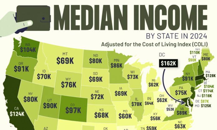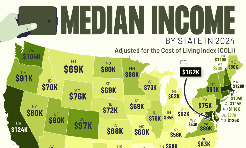 HomeMarkets Markets Mapped: Median Income by State in 2024 By news June 26, 2024 0 90 FacebookTwitterPinterestWhatsApp To gain insight into the U.S. economy, we’ve visualized the median income by state, as of May 2024. These figures come from WalletHub, which sourced …This post was originally published on this site Share FacebookTwitterPinterestWhatsApp Subscribe Login Notify of new follow-up comments new replies to my comments Please login to comment 0 Comments Inline Feedbacks View all comments Stay Connected149,322FansLike396,312FollowersFollow2,660SubscribersSubscribe Latest Articles Markets F*cked Up Thursday – Donald Trump Breaks the World – Again Energy Why the damage to Qatar’s gas infrastructure could push costs higher for years to come Markets Trump risks falling in to the ‘asymmetric resolve’ trap in Iran − just as presidents before him did elsewhere Markets Trump’s Fateful Choice Top Trades PSW Top Trade Alert – April 1st 2026 – Nike (NKE) Markets PhilStockWorld Top Trade Alert – April 1st 2026 – Conagra Brands (CAG) Markets Wednesday Recovery – Hope Springs Eternal Ahead of Trump’s Speech This Evening Market News Trump Is Flailing on Iran Market News The Psychology of Military Incompetence Market News No Good Way Out AI ‘AI-driven traffic is the fastest-growing category of internet traffic’: New report claims it’s official AI Alphabet Climbs 5%: Google’s Nine-Minute Bitcoin Warning Is Turning Heads on Wall Street Energy After the Iran war, how fast could global trade recover? Top Trades PSW Top Trade Alert – March 31st 2026 – Alphabet (GOOGL) Load more