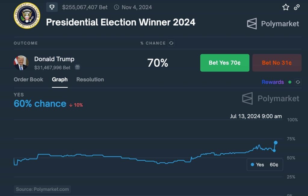 HomeMarkets Markets Prediction market prices a 70% chance of Trump’s re-election after failed assassination By news July 14, 2024 0 177 FacebookTwitterPinterestWhatsApp Donald Trump was reportedly shot in the ear during a Pennsylvania rally on July 13, suddenly boosting the candidate’s popularity. The prediction …This post was originally published on this site Share FacebookTwitterPinterestWhatsApp Subscribe Login Notify of new follow-up comments new replies to my comments Please login to comment 0 Comments Inline Feedbacks View all comments Stay Connected149,435FansLike396,312FollowersFollow2,650SubscribersSubscribe Latest Articles Markets Monday Market Mayhem – G7 Oil Promises Avert Disaster – For Now Markets World War Trump – Sunday Night Market Massacre (and it’s only week one!) Markets Operational Excellence, Strategic Incompetence Markets OpenAI on Surveillance and Autonomous Killings: You’re Going to Have to Trust Us Markets Meet the quiet winners of the Supreme Court tariff ruling: hedge funds creating a $100 billion market snapping up rights to importers’ tariff refunds Energy War in Middle East brings uncertainty and higher energy costs to already weakening US economy Market News Kasparov: Iran: The Russia-Ukraine Angle Markets The ‘Arrogance of Power’ Drives War in Iran Energy The Economy’s Warning Light Is Flashing Yellow Energy ‘Ugly’: Trump’s job market shrinks as oil fears mount Hot Items The Glaring Oversight in the U.S. War Plan Energy The Gulf Countries Can’t Take Much More AI America Cannot Withstand the Economic Shock That’s Coming Markets TGIF – Stop the Week, We Want to get Off – WWIII Edition Load more