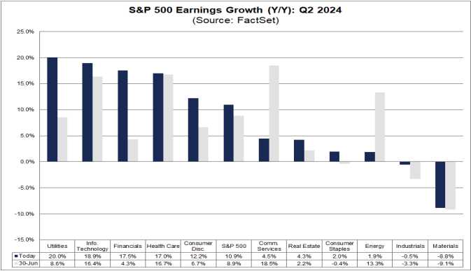 Small Cap companies are also more sensitive to interest rate changes but they are in more of a show me state than the Large Caps. The Russell is more weighted to Regional Banks, which have been struggling in 2024 while the NYSE has Big Tech – and it’s been a Big Tech sort of year with overall earnings up 10.9% thanks to Big Tech and Financials while Materials are down 8.9% and those kind of companies are leading the small caps lower…