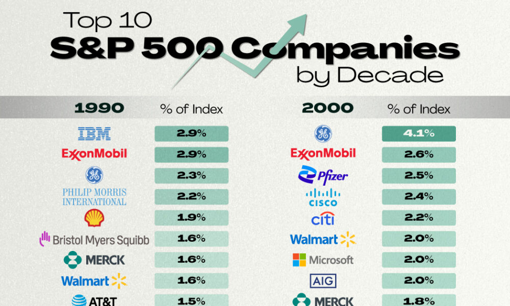 HomeMarkets Markets How the Top S&P 500 Companies Have Changed Over Time By news October 3, 2024 0 315 FacebookTwitterPinterestWhatsApp Launched in 1957, the S&P 500 is a benchmark index that tracks the performance of the 500 largest publicly traded companies in the U.S. It serves as …This post was originally published on this site Share FacebookTwitterPinterestWhatsApp Subscribe Login Notify of new follow-up comments new replies to my comments Please login to comment 0 Comments Inline Feedbacks View all comments Stay Connected149,526FansLike396,312FollowersFollow2,650SubscribersSubscribe Latest Articles Markets Interesting Market Activity Noted Markets Trump’s EPA decides climate change doesn’t endanger public health – the evidence says otherwise Markets CPI Friday – Fear Drives the Market – Should We Buy This Dip? Climate Trump just killed the EPA’s ability to fight climate change. It may backfire. AI Swarms of AI bots can sway people’s beliefs – threatening democracy Biotech FDA rejects Moderna’s mRNA flu vaccine application – for reasons with no basis in the law AI Paul Krugman: No, AI Doesn’t Justify Lower Interest Rates Markets Fact Check Thursday – What is Really Going on in the Economy? AI What dating apps are really optimizing. Hint: it isn’t love Biotech Why is US health care still the most expensive in the world after decades of cost-cutting initiatives? Market News Federal Debt to Hit Record Levels, Budget Office Warns Biotech The FDA Refuses To Review Moderna’s Flu Vaccine Markets Will We Hold It Wednesday? Nasdaq 25,000 Edition AI Data centers are scrambling to power the AI boom with natural gas Load more