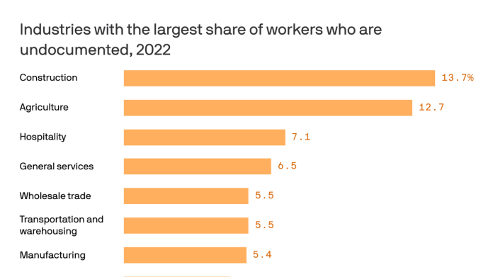 HomeMarkets Markets The industries that could be hardest hit by Trump’s immigration crackdown By Ilene November 19, 2024 0 219 FacebookTwitterPinterestWhatsApp President-elect Trump’s vow to deport millions of undocumented immigrants could eliminate workers from U.S. industries already projected to face …This post was originally published on this site Share FacebookTwitterPinterestWhatsApp Subscribe Login Notify of new follow-up comments new replies to my comments Please login to comment 0 Comments Inline Feedbacks View all comments Stay Connected149,753FansLike396,312FollowersFollow2,560SubscribersSubscribe Latest Articles AI Kara Swisher Nukes the Tech Bros AI Kara Swisher & Scott Galloway’s 2026 Predictions on AI, Stocks, Trump, and… Lesbians? AI Anthropic C.E.O.: Massive A.I. Spending Could Haunt Some Companies AI Kara Swisher on AI Bubbles, Big Tech and Life after Trump Markets PSW/AGI Round Table Bitcoin (BTC) Special Report Markets First Friday of 2026 – Let the Market Games Begin! Markets The Global Economy Must Adapt to Avoid Tumult This Year Markets Elon Musk indicates he’s ‘going all in’ on financing the GOP ahead of the midterms… Energy The New World Order Is Here – Peter Zeihan Hot Items Has the Fed fixed the economy yet? And other burning economic questions for 2026 Market News Trump’s Tangled Web of Deal-Making, Policy and Riches Energy World’s Largest Nuclear Plant Coming Back Online in Japan Energy The Beginning of the End of the Shadow Fleet AI 2026 Predictions Load more