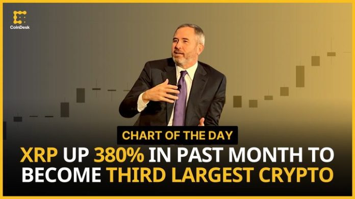 XRP, the payments-focused cryptocurrency, has skyrocketed over 380% in the last 30 days. This comes as bitcoin struggles to cross $100,000 amid faltering bitcoin dominance. CoinDesk’s Christine Lee presents the “Chart of the Day.”