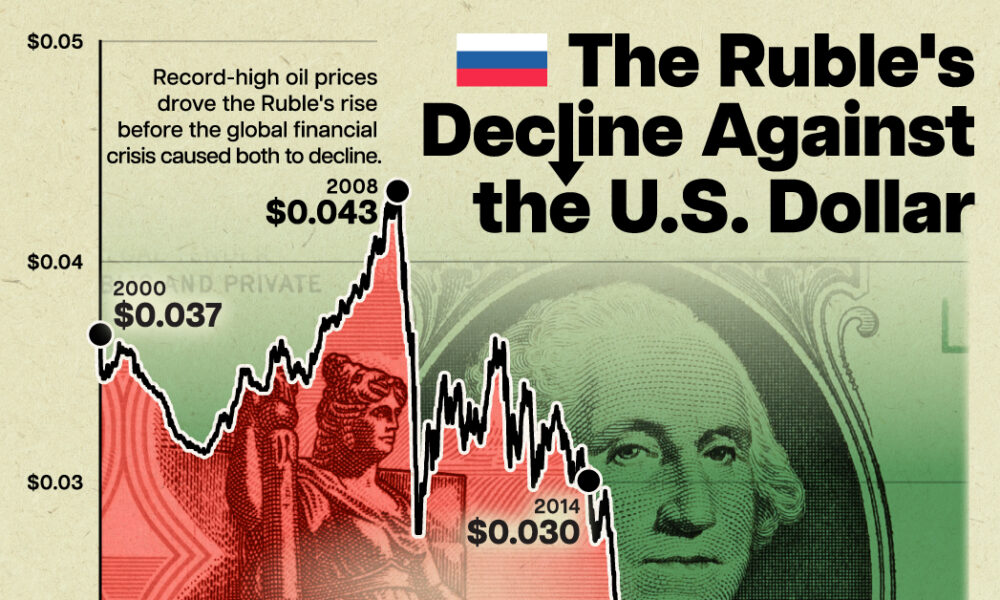 HomeMarkets Markets Charted: The Decline of the Russian Ruble By news December 4, 2024 0 203 FacebookTwitterPinterestWhatsApp See this visualization first on the Voronoi app. Use This Visualization The Russian ruble has declined sharply against the U.S. dollar following a new …This post was originally published on this site Share FacebookTwitterPinterestWhatsApp Subscribe Login Notify of new follow-up comments new replies to my comments Please login to comment 0 Comments Inline Feedbacks View all comments Stay Connected149,500FansLike396,312FollowersFollow2,650SubscribersSubscribe Latest Articles Markets What I Learned at PhilStockWorld.com Last Week – An AGI Round Table Review Charts PSW’s Weekly Webinar: Portfolio Review & FED Minutes (2/18/2026) AI Jared Sleeper on Which Software Companies Will Survive the SaaSpocalypse Market News Get Ready for Zombie Tariffs Hot Items The Supreme Court Just Ruled Trump’s Tariffs Unconstitutional Market News Supreme Court Blocks Tariffs Hours After Trump Bragged They Wouldn’t Markets TGIF Friday – Short Week Not Short Enough in the Fog of War AI The Worst-Case Future for White-Collar Workers Market News Russia tested NATO’s airspace 18 times in 2025 alone – a 200% surge that signals a dangerous shift AI DHS Opens a Billion-Dollar Tab With Palantir Market News From Iran to Ukraine: The growing risk of conflict Markets Thursday Thoughts – Oil at $66.6 Again – Bad Sign? Market News Japan’s Debt Crisis Is Just the Beginning Biotech FDA’s abrupt flip-flop on Moderna’s mRNA flu shot highlights growing risks to drug-makers of investing in vaccines Load more