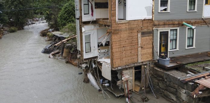 Heavy rain sent Great Brook raging over its banks in Plainfield, Vt., in July 2024. AP Photo/Ted Shaffrey