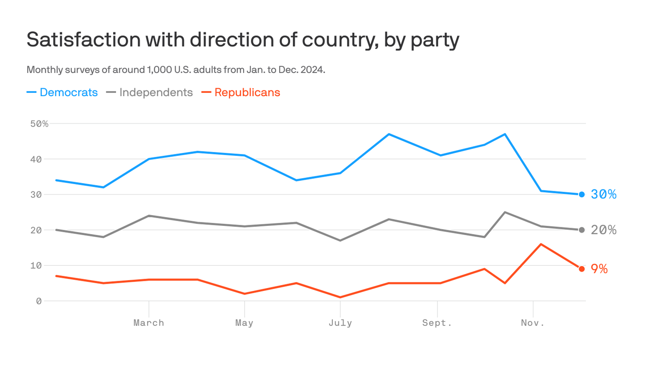 HomeMarkets Markets Americans end 2024 feeling pessimistic about the U.S. By news December 26, 2024 0 199 FacebookTwitterPinterestWhatsApp Just 19% of Americans believe the country is heading in the right direction as 2024 comes to a close, per Gallup’s latest monthly survey. Why it …This post was originally published on this site Share FacebookTwitterPinterestWhatsApp Subscribe Login Notify of new follow-up comments new replies to my comments Please login to comment 0 Comments Inline Feedbacks View all comments Stay Connected149,535FansLike396,312FollowersFollow2,650SubscribersSubscribe Latest Articles Climate Trump just killed the EPA’s ability to fight climate change. It may backfire. AI What dating apps are really optimizing. Hint: it isn’t love AI Swarms of AI bots can sway people’s beliefs – threatening democracy Biotech FDA rejects Moderna’s mRNA flu vaccine application – for reasons with no basis in the law AI Paul Krugman: No, AI Doesn’t Justify Lower Interest Rates Markets Fact Check Thursday – What is Really Going on in the Economy? Biotech Why is US health care still the most expensive in the world after decades of cost-cutting initiatives? Market News Federal Debt to Hit Record Levels, Budget Office Warns Biotech The FDA Refuses To Review Moderna’s Flu Vaccine Markets Will We Hold It Wednesday? Nasdaq 25,000 Edition AI Data centers are scrambling to power the AI boom with natural gas AI America Isn’t Ready for What AI Will Do to Jobs Market News As Jeff Bezos dismantles The Washington Post, 5 regional papers chart a course for survival Markets Tuesday Turmoil: The Matrix Economy – Capital Hegemony and the Infrastructure War Load more