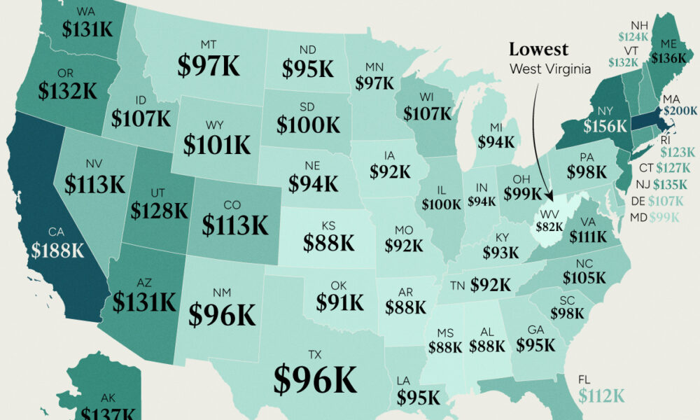 HomeMarkets Markets Mapped: The Living Wage for a Family of Four, by State By news January 27, 2025 0 54 FacebookTwitterPinterestWhatsApp The Living Wage for a Family of Four, by State More than 13 million American households include two children at home. To illuminate how expenses vary …This post was originally published on this site Share FacebookTwitterPinterestWhatsApp Subscribe Login Notify of new follow-up comments new replies to my comments Please login to comment 0 Comments Inline Feedbacks View all comments Stay Connected149,418FansLike396,312FollowersFollow2,650SubscribersSubscribe Latest Articles Charts Wartime Investing (3/11/2026) Market News The Latest Economic Numbers Are Brutal for Trump Markets Not just Patriot interceptors: A defense expert explains the various weapons US and allies use to defend against missiles and drones Energy Ian Bremmer: Thoughts on Trump’s war with Iran Markets Iran’s ruling structure explained Markets Friday the 13th (again) – Week 3 of World War III Begins Energy The War With Iran Could Reshape the Global Economy AI Dario Amodei’s Oppenheimer Moment Energy Trump and Rubio dismantled U.S. diplomacy. It’s making the Iran War harder. Energy Trump’s Iran Blunders Suddenly Look Darker After Damning New Leaks Hit Energy Iran’s new supreme leader vows revenge on U.S., Israel Markets Thursday – 13th Day of War Not Lucky for Trump – Or the World! Market News Why cloud service outages ripple across the internet – and the economy AI US military leans into AI for attack on Iran, but the tech doesn’t lessen the need for human judgment in war Load more