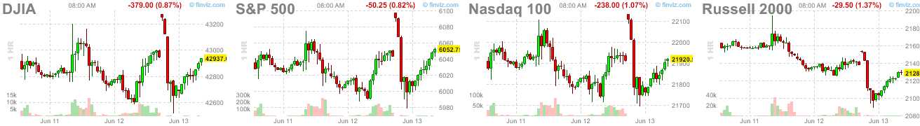 - Mixed Market Performance: On Thursday, June 12, US stock indexes generally closed higher, with the S&P 500 up 0.4%, the Nasdaq Composite up 0.2%, and the Dow Jones Industrial Average up 0.2%. However, this comes after some earlier volatility and small caps (Russell 2000) saw a decline. As of Friday morning, stock futures are sliding, with the Dow, S&P 500, and Nasdaq futures all down.