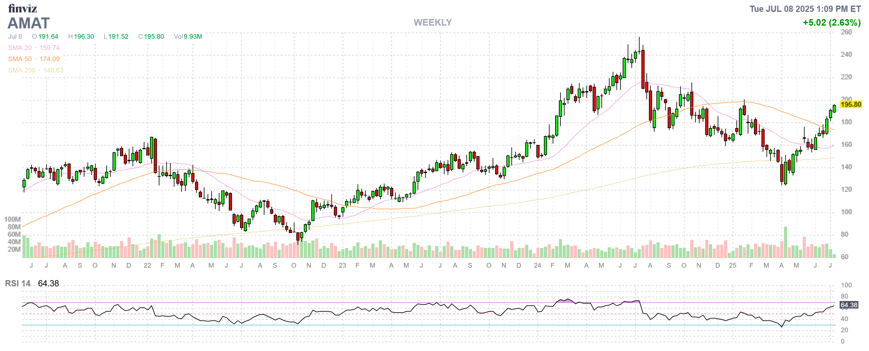 • Buy 3 AMAT Dec 2027 $180 calls for $56.50 ($16,950)