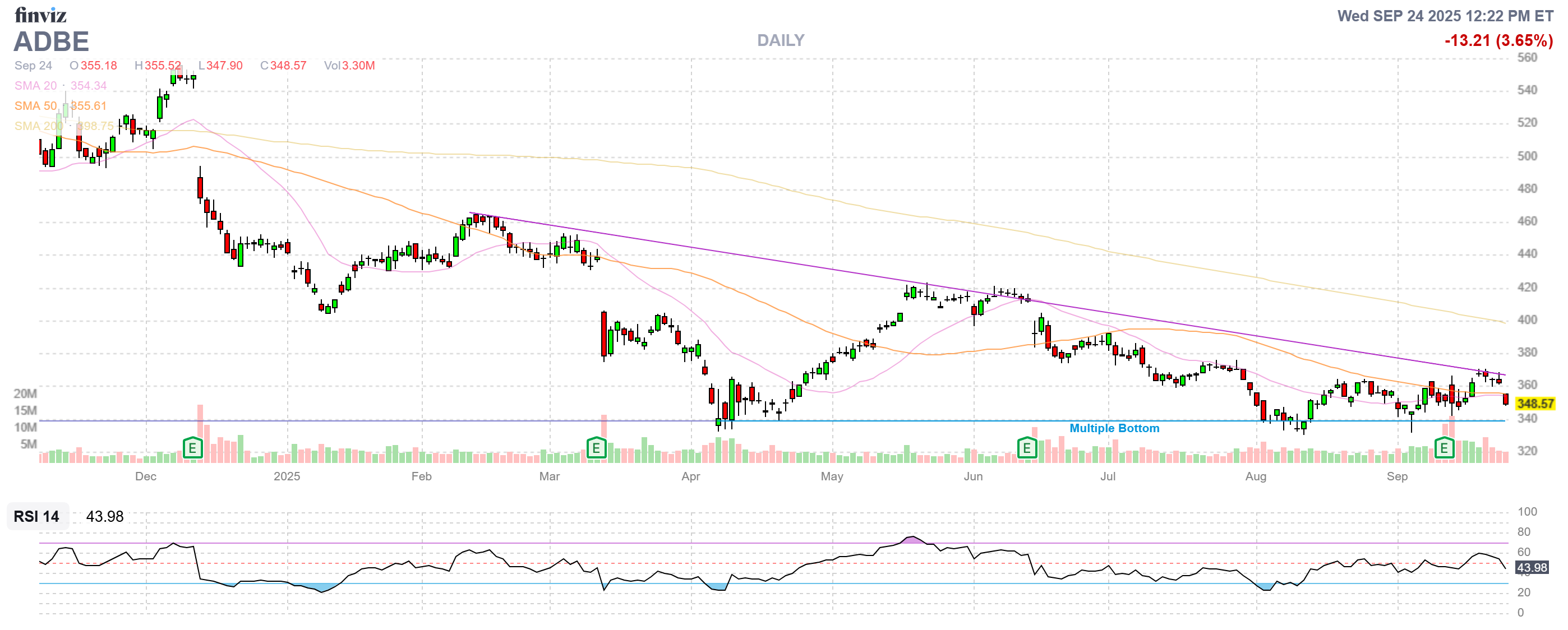 Adobe’s stock declined Wednesday, extending its losing streak and bringing its year-to-date loss to 21%.