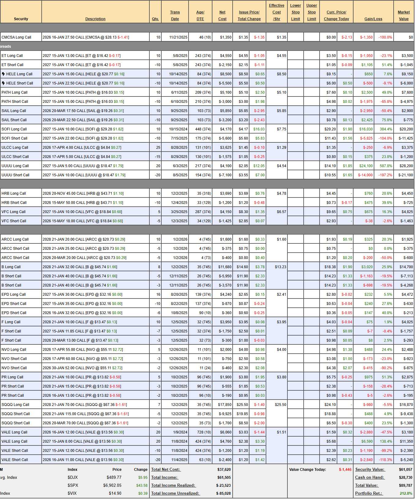 - ULCC – Came down a lot (was $6) on uninspiring revenue projections but I want to give them until next earnings (early Feb) as I think the overall outlook for 2026 should be improving. It’s a $2,500+ spread if we can get back to $5 and currently net $2,175 with $325 (14.9%) upside potential in 4 months – not terrible.