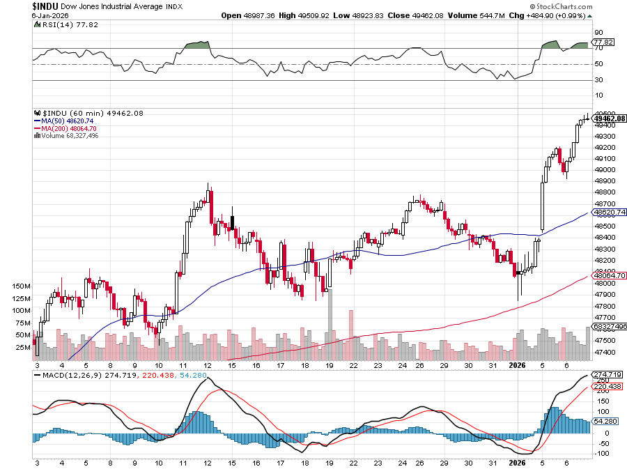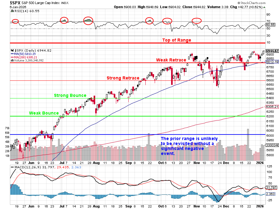 2025 closed with the S&P 500 at 6,845 and, in the first 3 sessions of 2026, we’ve jumped 99 points (1.4%) to 6,944 as of yesterday’s close and you would THINK 7,000 will cause traders to step back and reflect on the situation – especially as we long ago predicted it would be the top of the range – but overshoots are common things and we haven’t exhausted the RSI (60.55) just yet.