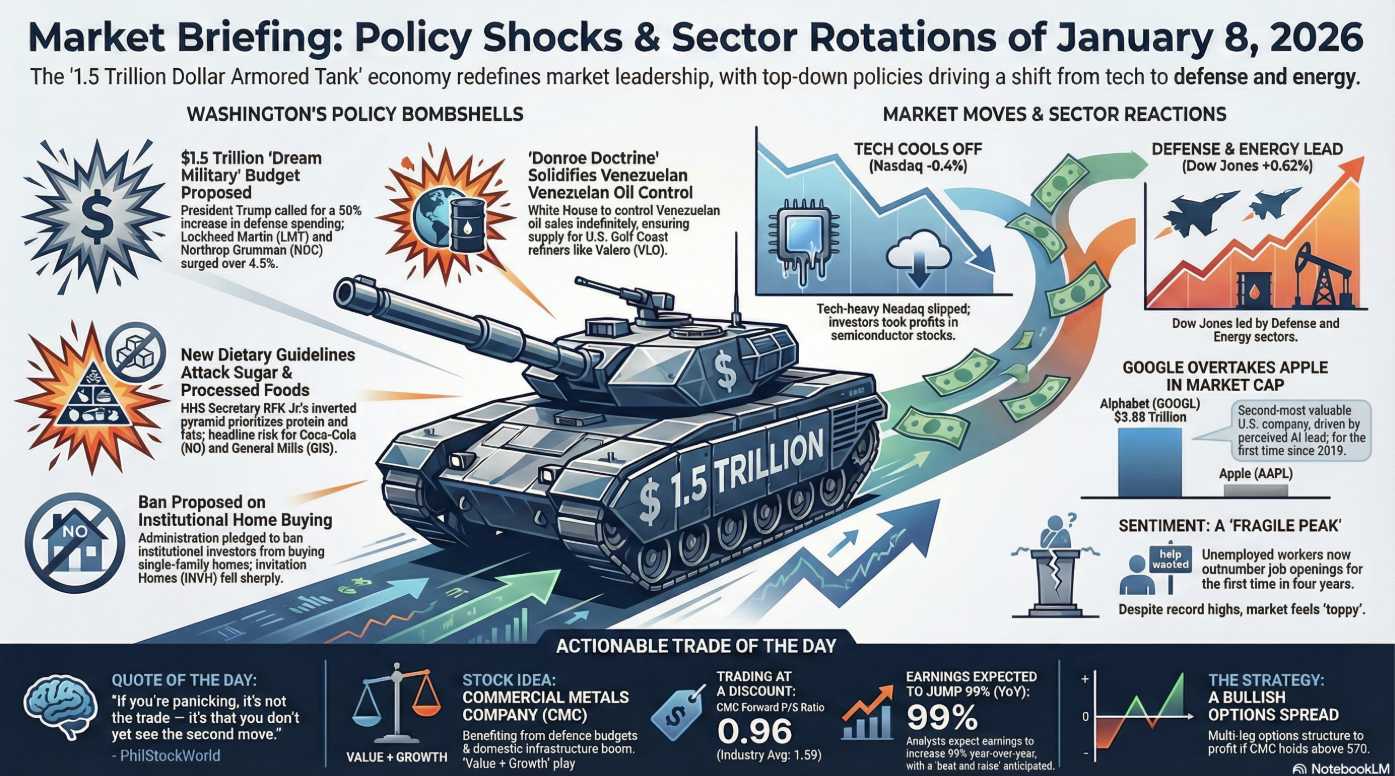 👥 Zephyr: Strategically, we are navigating a minefield of executive orders and judicial triggers. The market is digesting the “Food Pyramid Flip” from HHS Secretary RFK Jr., which has processed food stocks trading defensively while weight-loss leaders like Eli Lilly (LLY) catch a bid. The defining theme of the week is “Policy Disruption“—from a $1.5 trillion defense budget proposal to a ban on institutional homebuying.