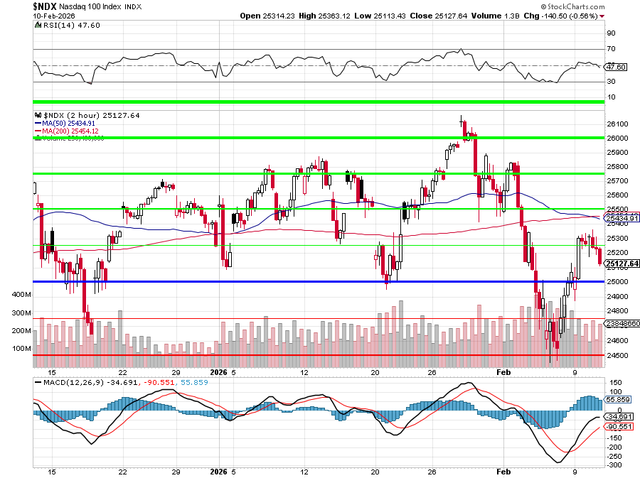 That’s a very ugly 2-hour chart! The 60-minute chart is just as ugly but the daily chart is not so bad BUT we hit 26,000 in October and that was the last hurrah for the great Nasdaq rally – so far – as the Shiller P/E Index hit 40 (now 40.36). And yes, we were valuing stock at 40 times earnings before – in early 2000, in fact – that ended well, didn’t it?