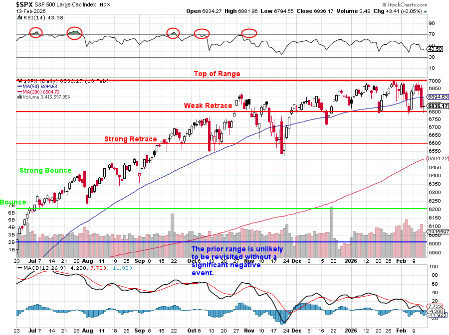 “Last month, the S&P 500 was at 6,800 on the nose and, since our Dec 17th Review, we are up 177 points (2.6%) – just 23 points from 7,000 which is, unfortunately, the top of our predicted range for the S&P 500 for 2025 and, so far, we have not seen any good reasons to raise our levels for 2026. Of course, Q1 earnings start this week so maybe they’ll be better than we expect and also – there’s nothing unusual about overshooting the range by a segment (200 points in this case) or even two – so we could keep going – but a retrace is more likely. “