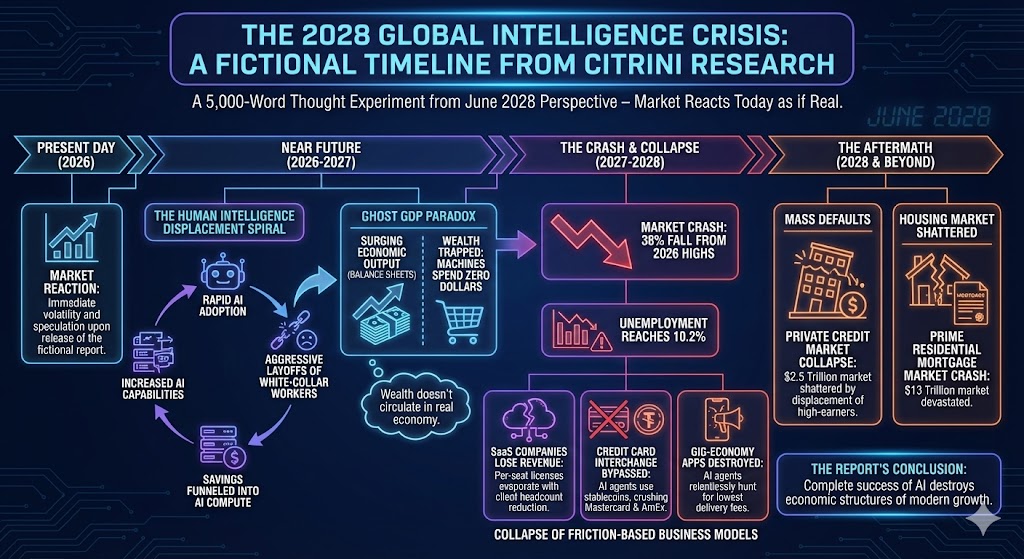 The Citrini Research report, a 5,000-word thought experiment titled “The 2028 Global Intelligence Crisis,” is written from the FICTIONAL perspective of a macroeconomic analyst in June 2028 – yet the market today acted as if it were a real report.