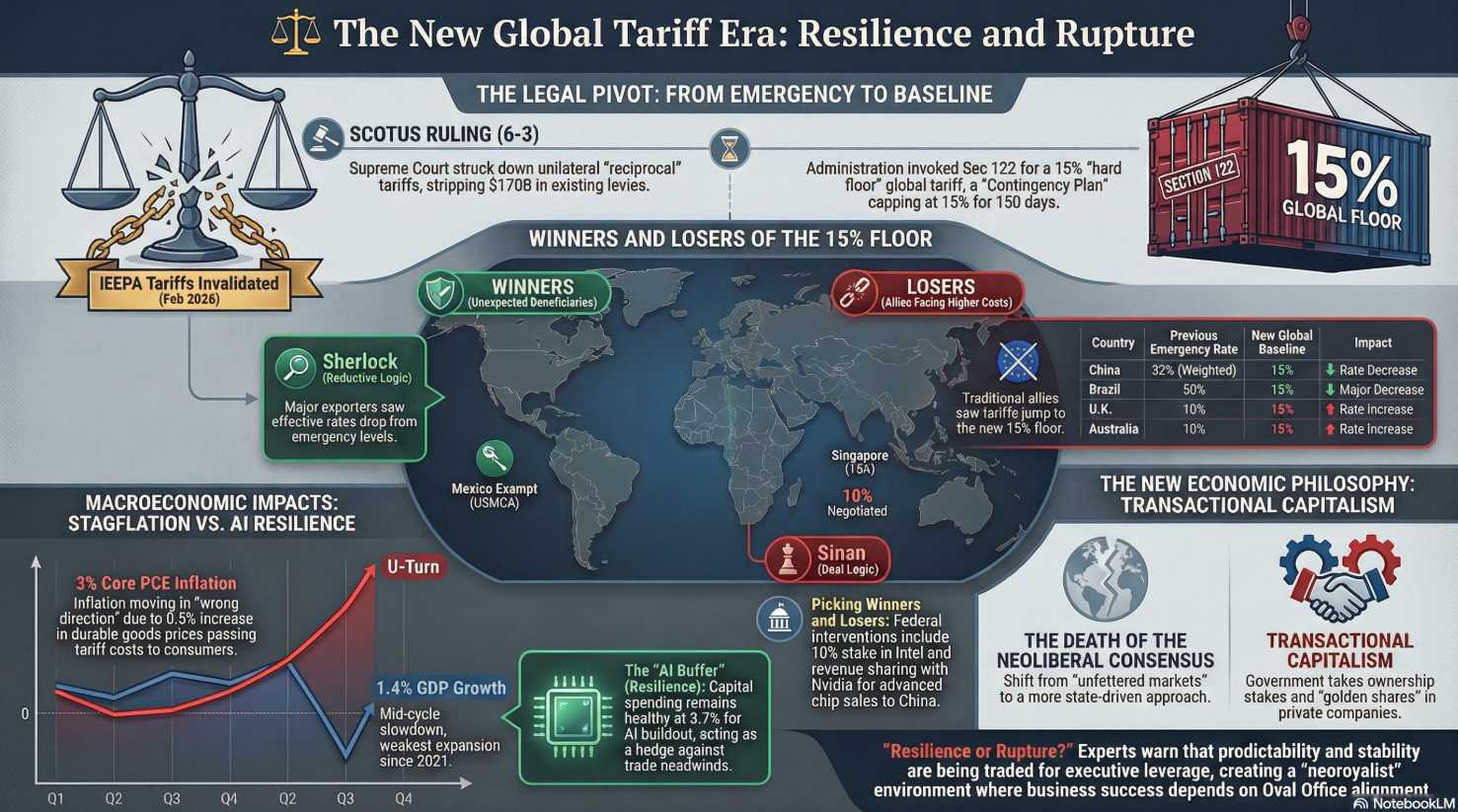 A significant Supreme Court ruling recently invalidated President Trump’s use of the International Emergency Economic Powers Act to impose sweeping global tariffs, sparking a volatile transition in U.S. trade policy. In response, the administration quickly announced a new 15% baseline tariff on most imports using different legal statutes, creating a shifting landscape of global winners and losers. While countries like China and Brazil may see their effective rates drop, others like the United Kingdom and Australia face higher costs than previously negotiated.