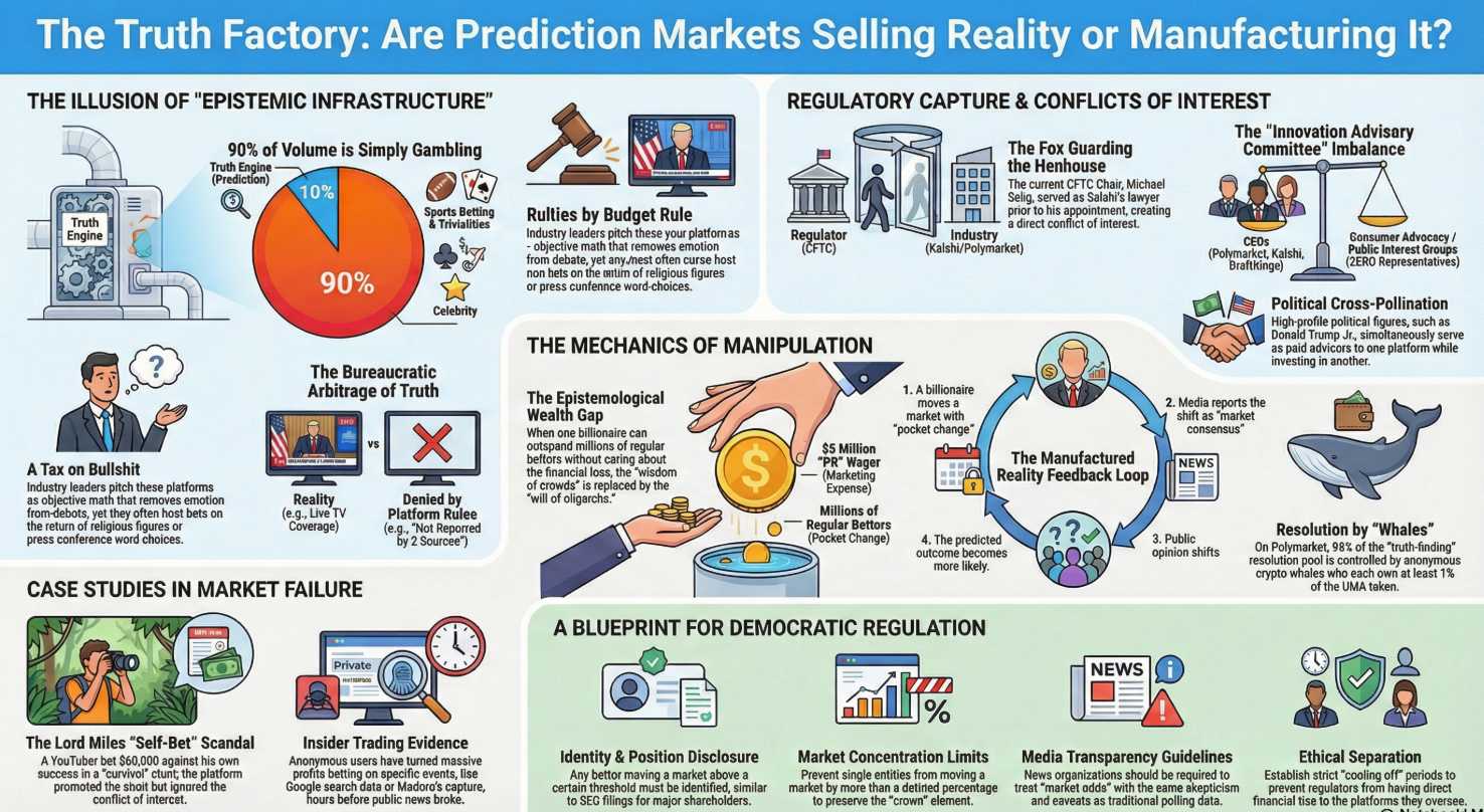 But the current implementation – anonymous crypto platforms, captured regulators, concentrated resolution power, billionaires who can move markets with pocket change, media outlets treating manipulable odds as expert consensus – turns the Truth Engine into something else entirely.