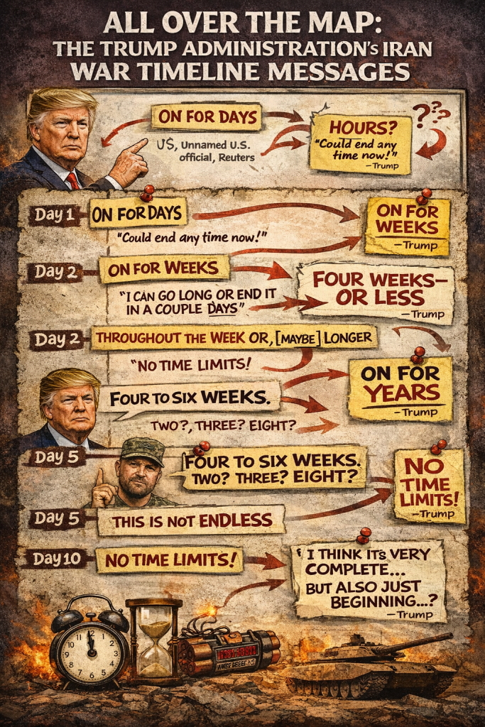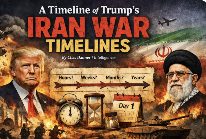 How long will President Trump’s new war with Iran last? That depends on who you’re asking, how, when, and perhaps whether or not the markets are currently freaking out. Since the start of the war, Trump, Secretary of War Pete Hegseth, and others have offered very mixed messages about the potential timeline for the conflict — which clearly isn’t ending anytime soon, or could end hours from now, or will go on as long as it has to, because the U.S. can go longer than any other country. It’s also proceeding way ahead of schedule, as Iran is being decimated and re-decimated and re-re-decimated daily. But the war is also now complete, or almost complete, or only just beginning. To help everyone keep track, below is an updating rough timeline of Trump and other officials’ emanations about the potential length of the war.