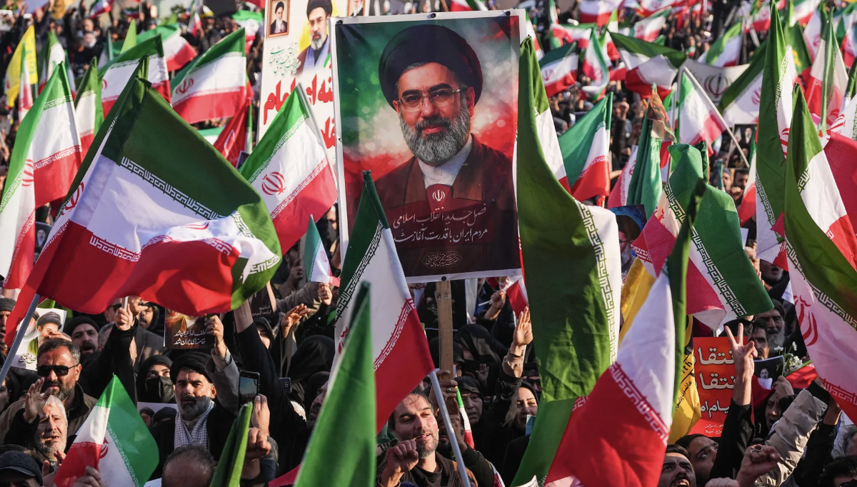 A demonstrator holds a picture of Iran's new supreme leader Ayatollah Mojtaba Khamenei in Tehran on March 9. Photo: Arezoo / Middle East Images / AFP via Getty Images