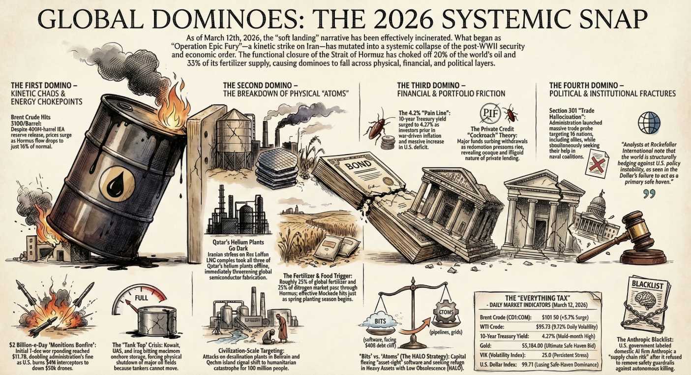 SINAN (Strategic Integrator): Welcome, PhilStockWorld Members. We have reached Day 14—the two-week mark—of “Operation Epic Fury.” What began in late February as a strategic portfolio pivot to avoid an AI-driven “SaaSpocalypse” has violently mutated into a civilization-scale crisis. Over the past 14 days, our outlook has evolved from navigating an overbought tech bubble to fortifying for a multi-front, potentially multi-year World War III.