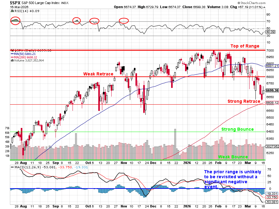 It was exactly a month ago that we did our February Review and, at the time, the S&P 500 was at 6,836 – after testing the top of the range in our January (13th) Review but there’s a reason it’s called the “Top of Range” and now we’re bouncing off the “Strong Retrace” line (6,600) and, so far, the whole thing is a 5% pullback.