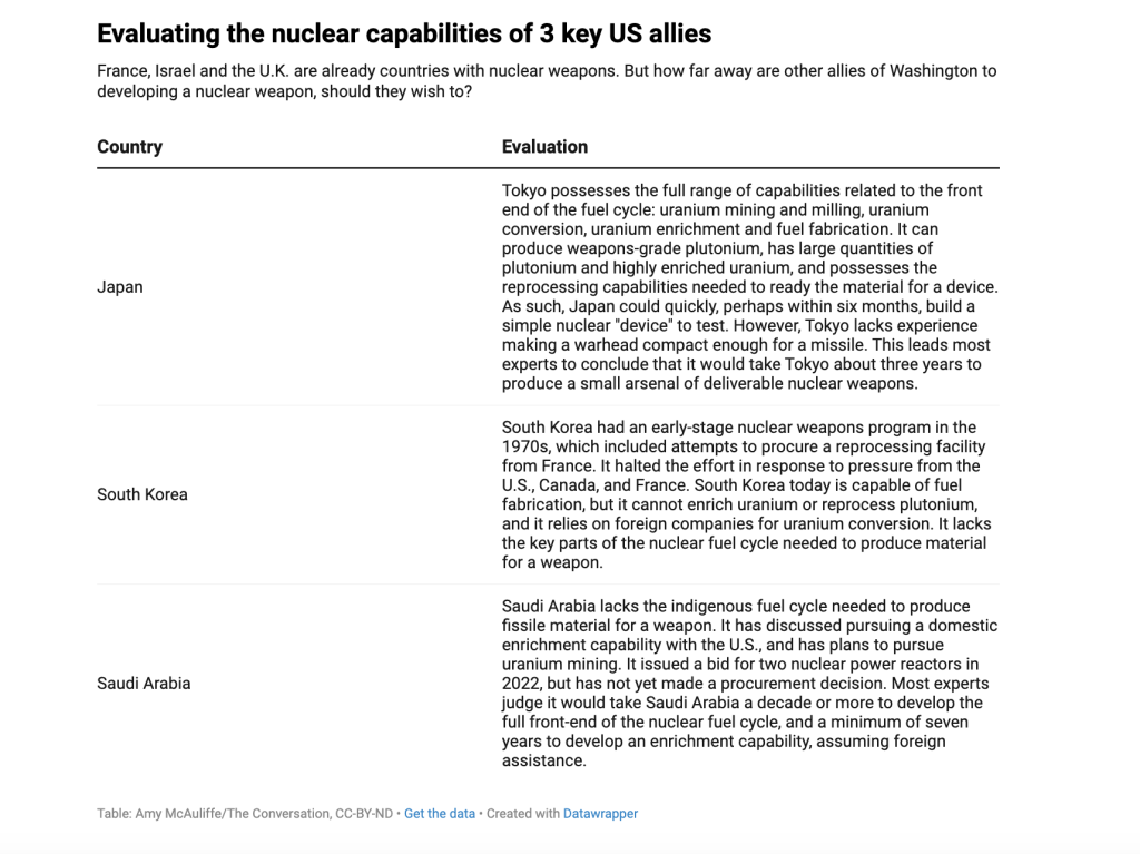 Until just a few years ago, few experts would have predicted that these nations – all allies of Washington – might one day join the nuclear club. Since 2006, that club has consisted of just nine countries: the United States, Russia, the United Kingdom, France, China, India, Pakistan, North Korea and Israel, with its undeclared program.