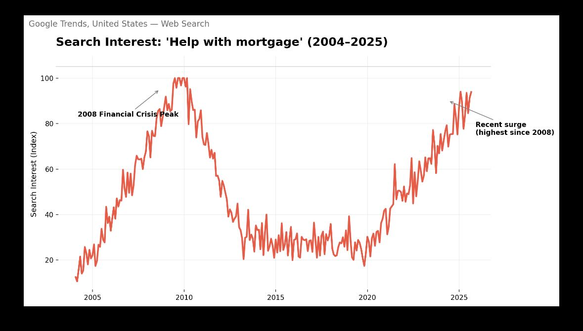 Wall Street thought the consumer was fine, but we noted that the Home Affordability Index had plummeted to 80, and we tracked behavioral data showing Google searches for “help with mortgage“ spiking to levels unseen since the Great Financial Crisis. We warned the community that over one million homeowners were trapped in negative equity, creating a fragile psychological breaking point. Looking back, we caught the exact moment the consumer base fractured, weeks before the retail earnings warnings and plunging mortgage applications made it front-page news.
