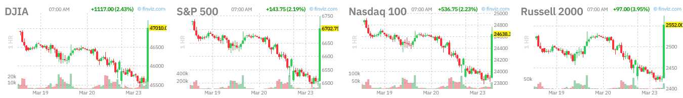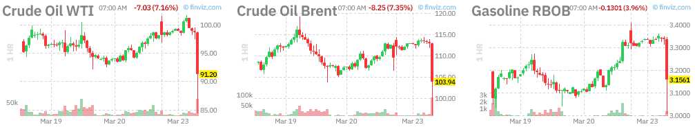 Dow Futures (7:30 am) are back to 47,000 – up more than 1,500 points from down 300 just 20 minutes ago. It took all of 5 minutes for the pre-market trading algos to jam the indexes back to Wednesday’s close as Oil fell over 10% from $98.50 to $84.37 and now sitting at $89.50/102.67 – still very bad but not as bad as it was looking so – YAY?!?
