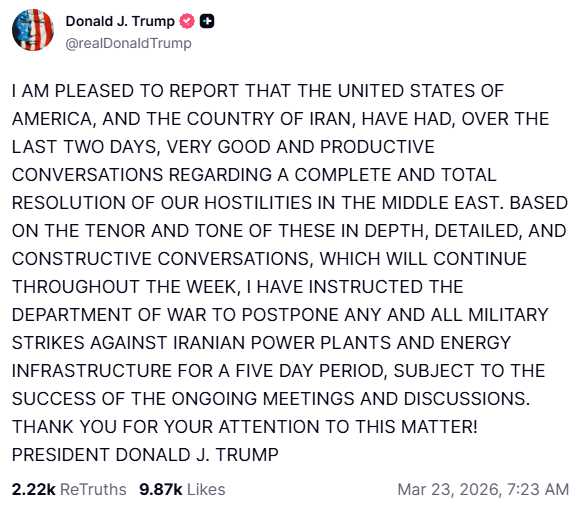 The President tweets from his bathroom that he’s having “productive conversations” with a regime that has spent the last 24 days turning the global energy grid into a Michael Bay movie. Iran immediately responds, “We have absolutely no idea what he’s talking about, he just retreated because we threatened to incinerate every power plant in West Asia“. And Wall Street’s reaction? “BUY EVERYTHING! THE WAR IS OVER!”