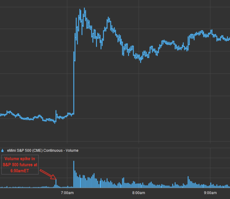 - At around 6:50 a.m. in New York, S&P 500 e-Mini futures trading on the CME recorded a sharp and isolated jump in volume.