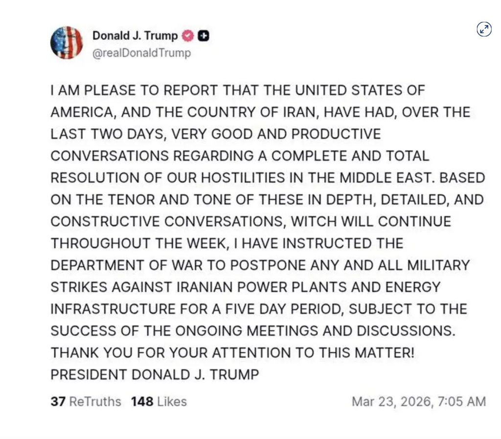 - Roughly 15 minutes later, at 7:05 a.m., Trump posted a market-moving announcement about Iran on Truth Social.